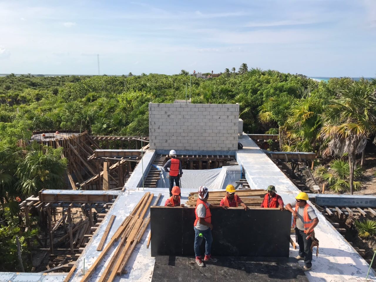 Sistema estructural a base de muros de concreto y marcos dúctiles, soportando losas macizas con trabes de concreto reforzado. Sistema de cimentación superficial, 2.000 m2 de construccion.